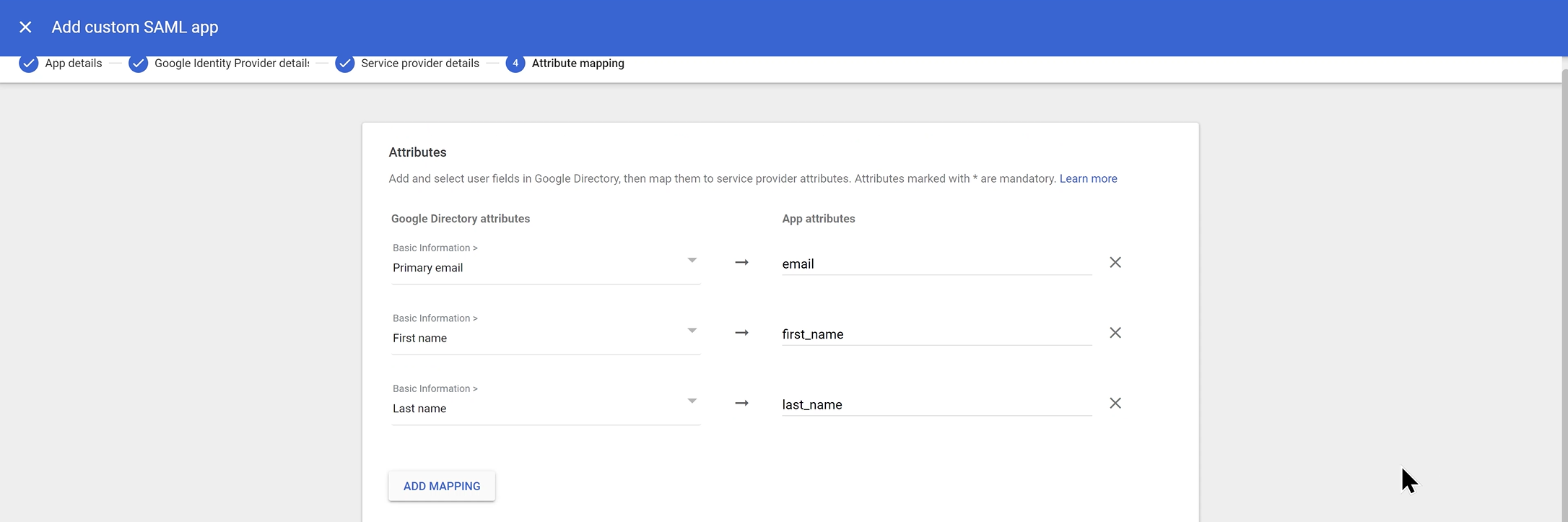 On the Attribute mapping screen, click Add mapping.
