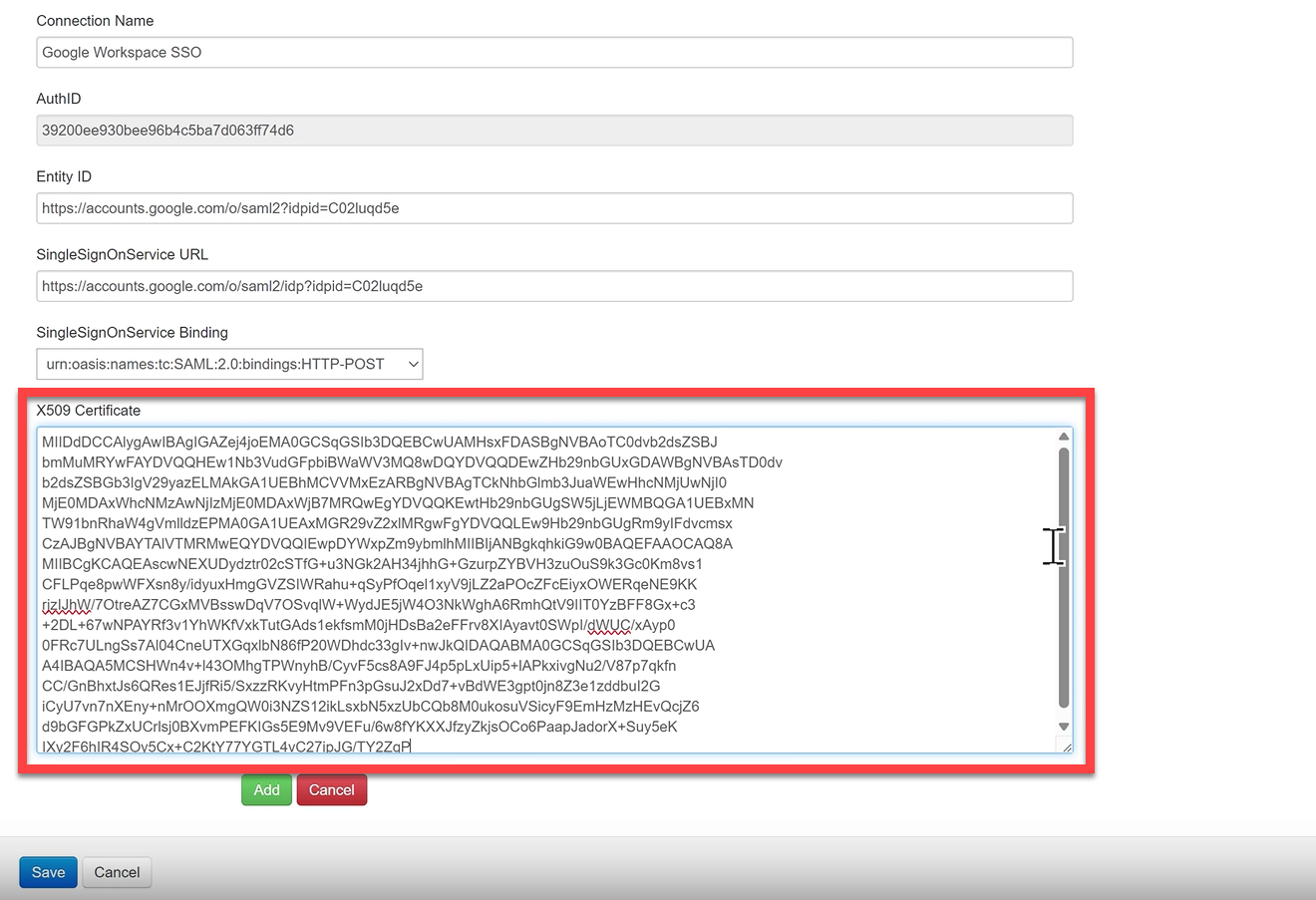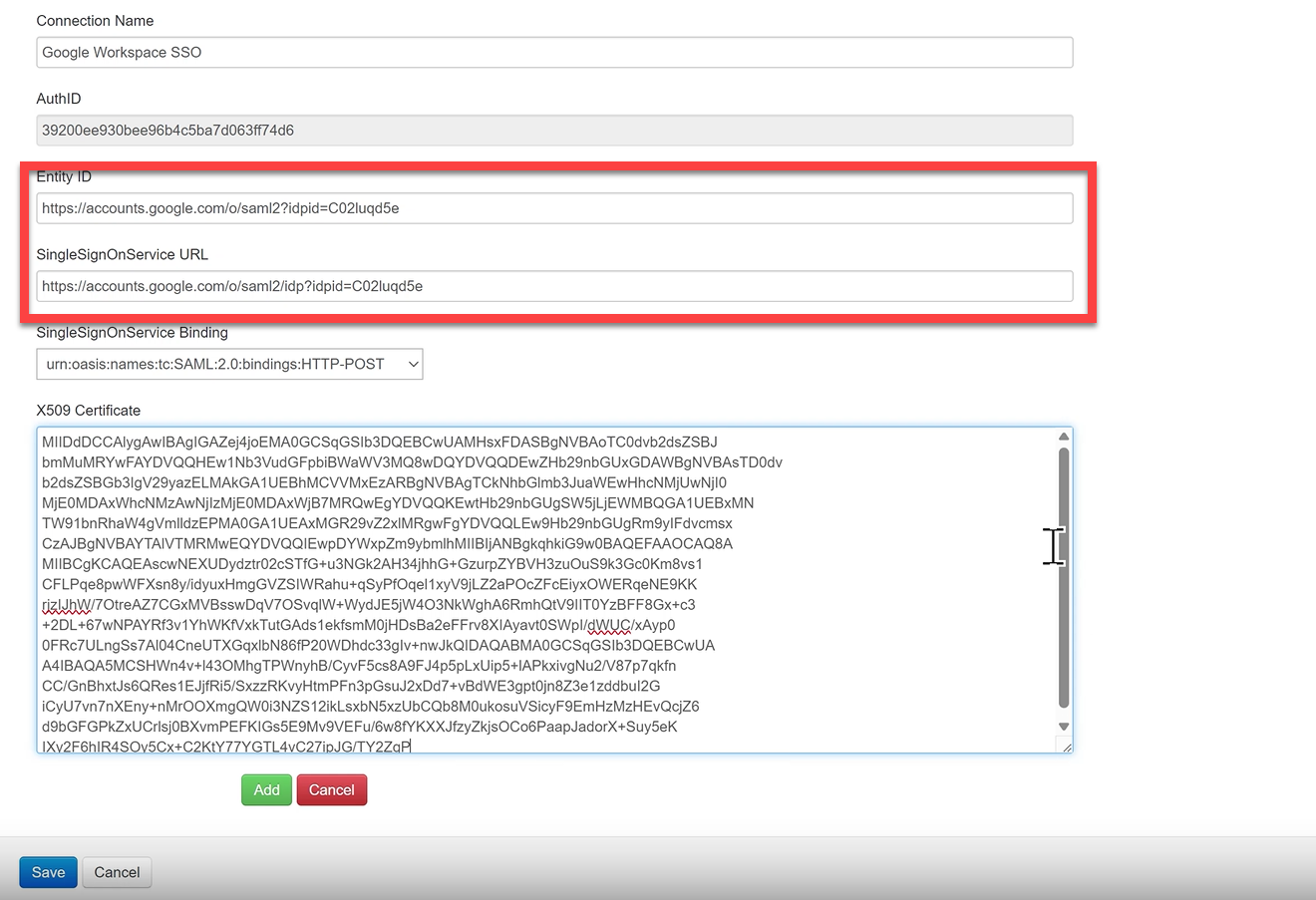 Google SSO - Paste the Google Entity ID → Entity ID